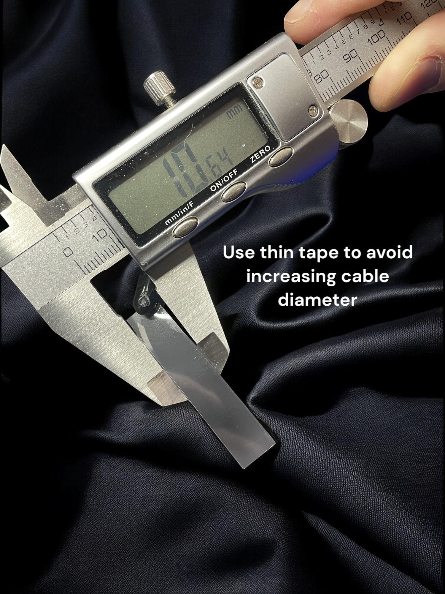 When cutting your tape, make sure it's enough to only wrap around the circumference of the cable once (we want to avoid increasing the cable thickness by having multiple layers of tape).