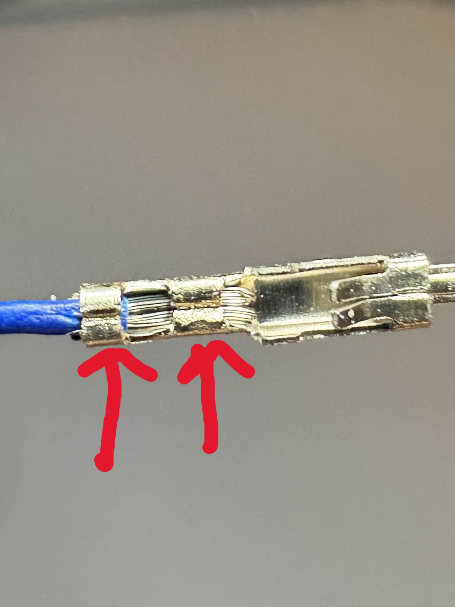 | The resulting crimp should look similar to the following image with the insulation being crimped by the first set of wings and the inner wires being crimped by the smaller set of wings. | ![]() |