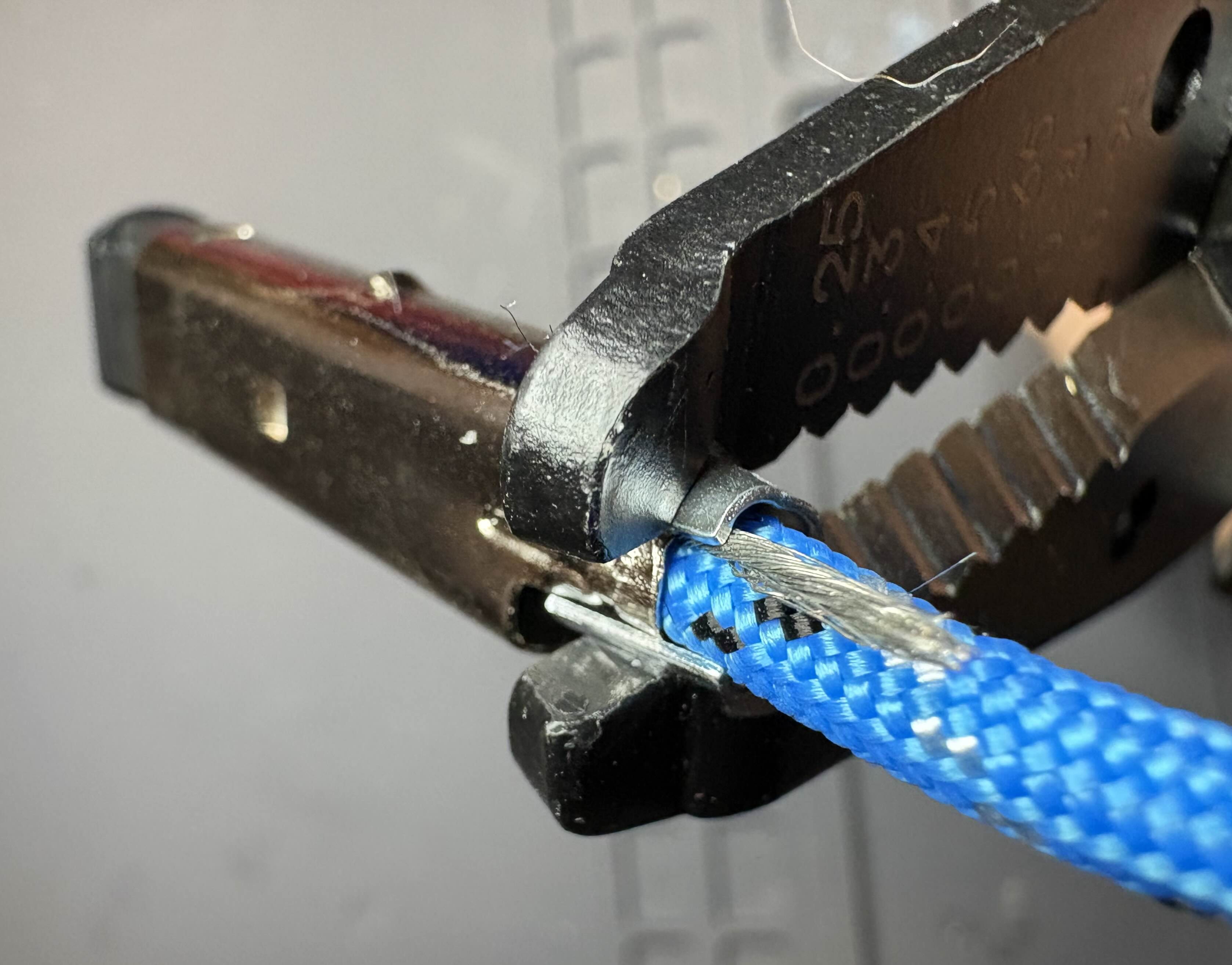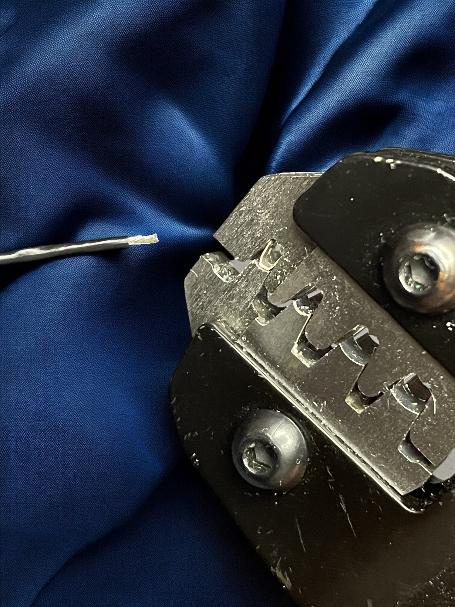 | Open up a ferrule/spacer, place it around the wings you just crimped, and tightly crimp. Ensure it's snug by tugging on the cable; we don't want it coming out when players YANK them from the ports! | ![]() |