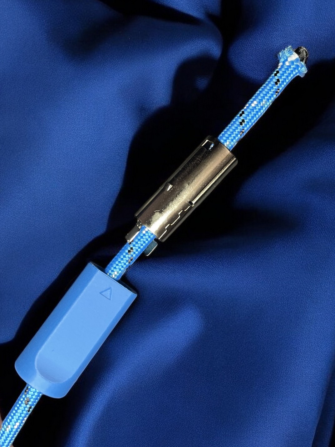 | Slide the metal casing up and over the twisted shielding and onto the black plug housing. Tuck the shielding underneath the paracord so that it sits as shown in the photo. | ![]() |