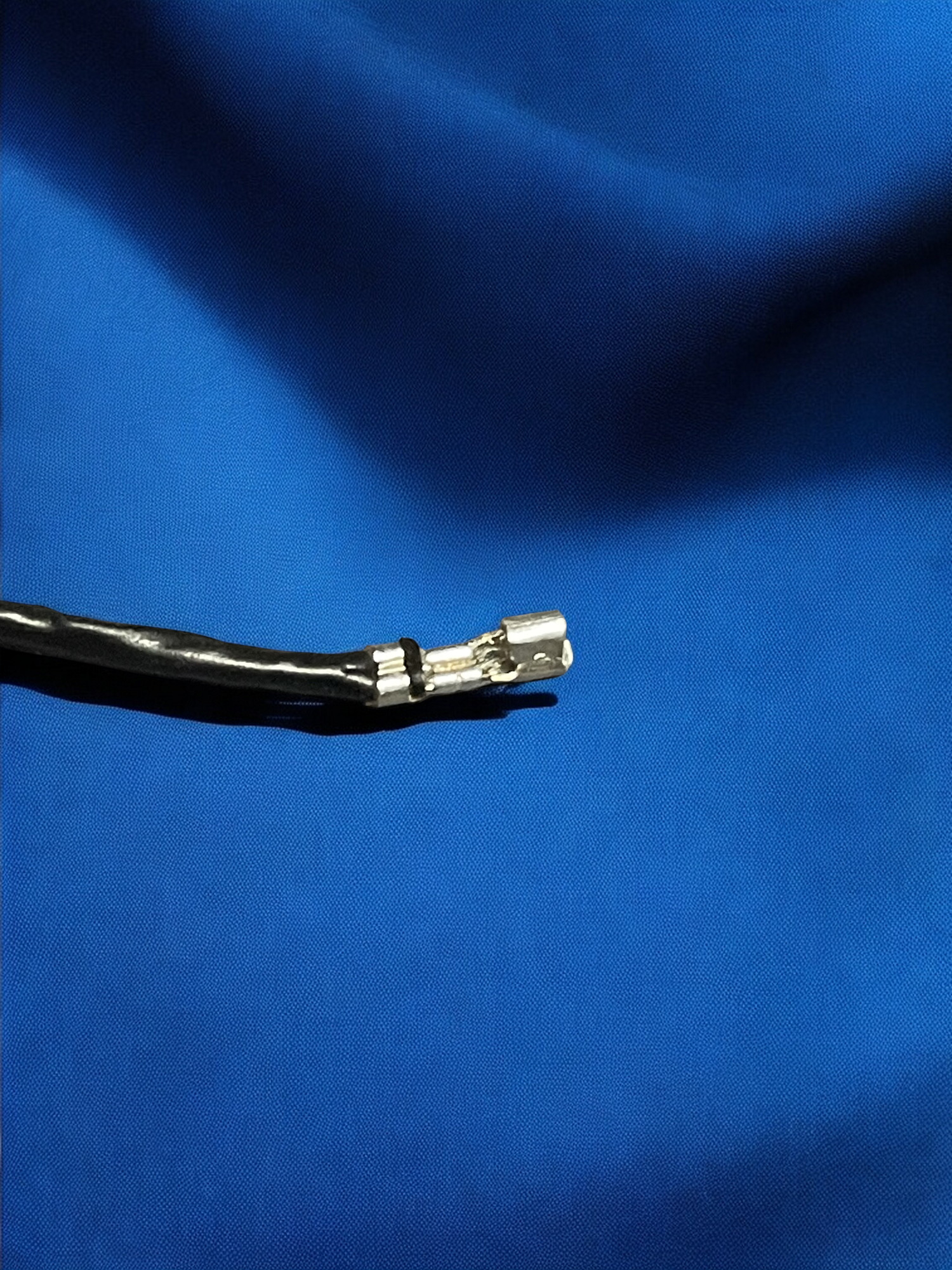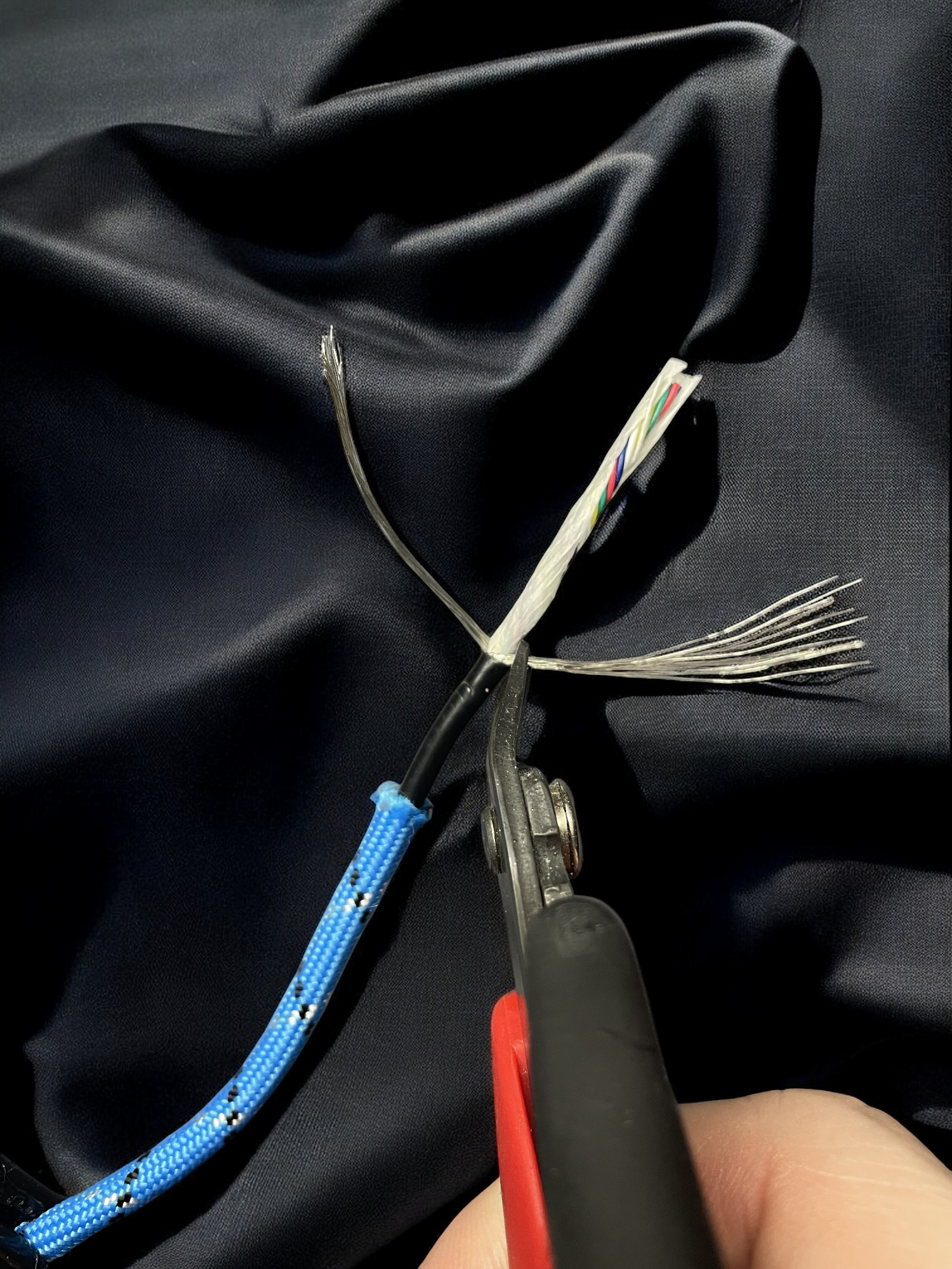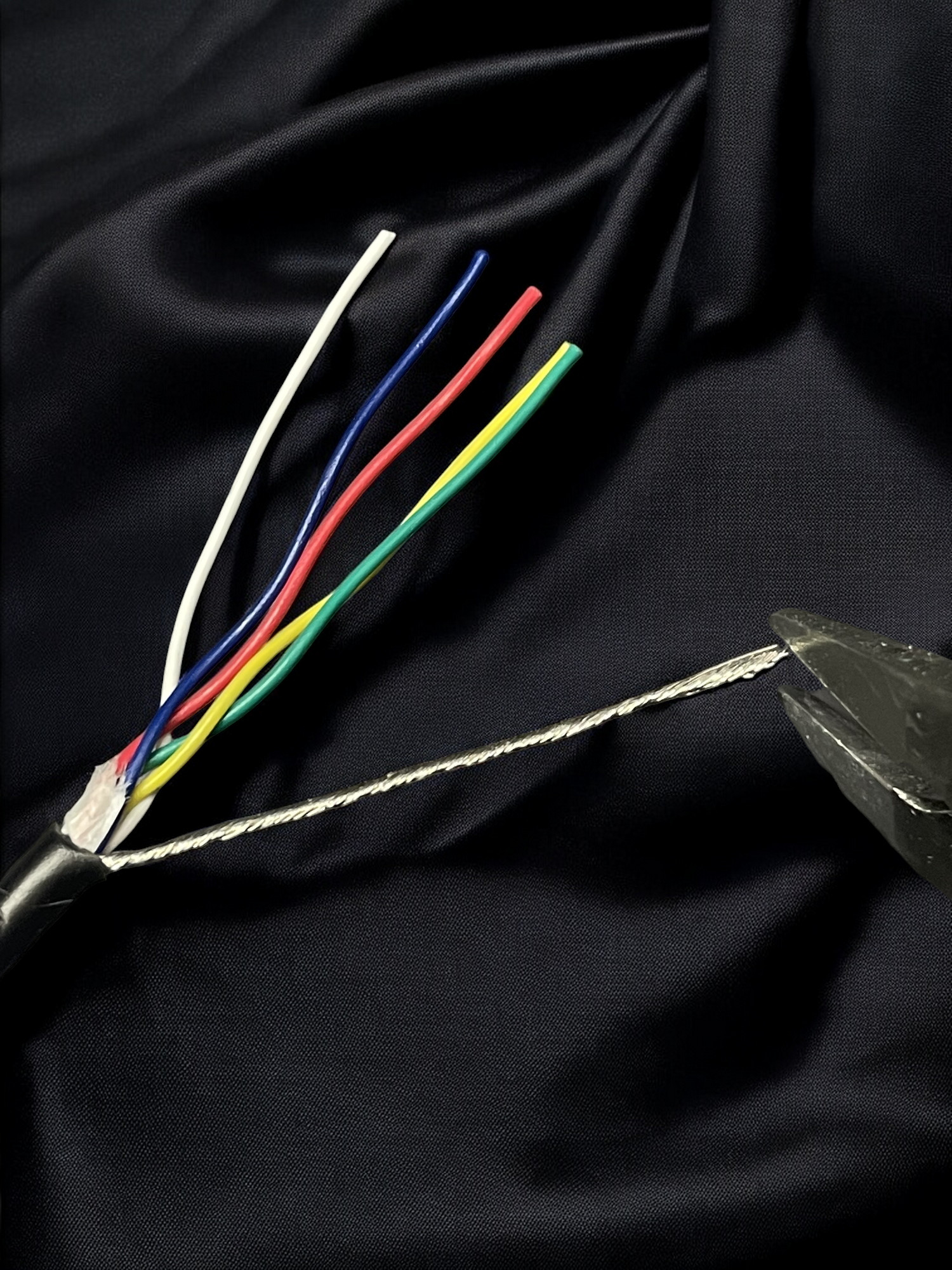 | Go back to the single remaining bunch of exposed drain wire and continually wind up in either direction until stiff. Ensure there are no loose strands flying in random directions. Using flush cutters or sharp scissors, cut off a very small portion near the tip so that they all sit nice and even. | ![]() |