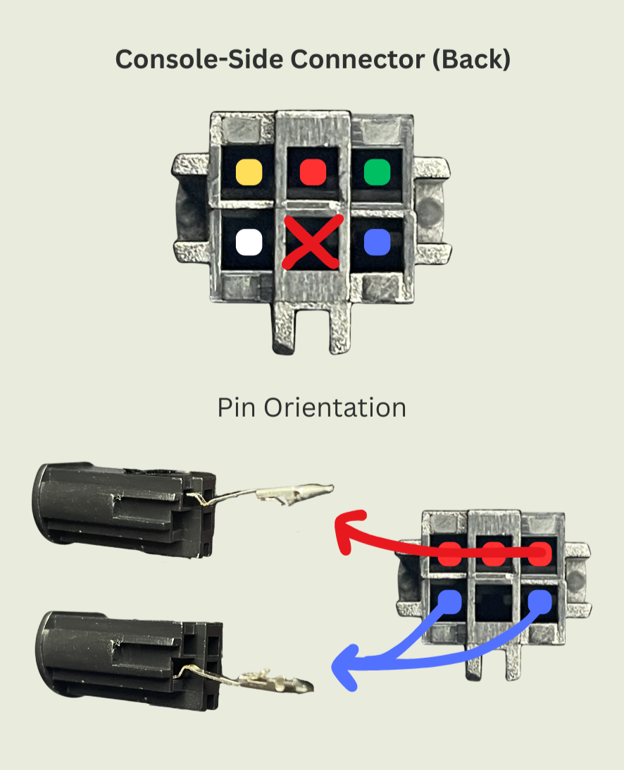 | Using the provided pinout insert each pin into the housing. Also keep note of the proper orientation. Note Provided pinout image is only for OEM, Retro Forge, or other cables that have the same insulation colors | ![]() |